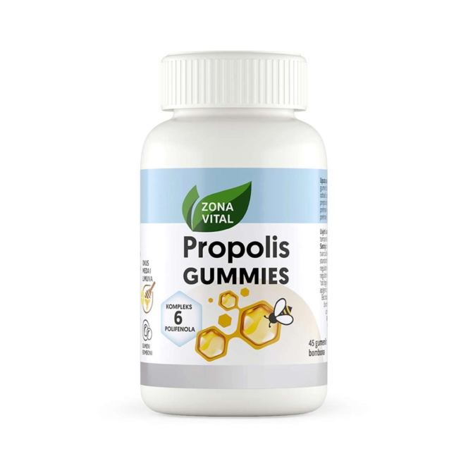 Suncokretov med; osmotska voda, sladilo: maltitol; tvar za želiranje: pektin; suhi ekstrakt propolisne smole standardiziran na 12 % polifenola* izraženih kao galangin; regulator kiselosti: limunska kiselina; aroma limuna, regulator kiselosti: natrijev citrat; tvar za poliranje: maltitol.